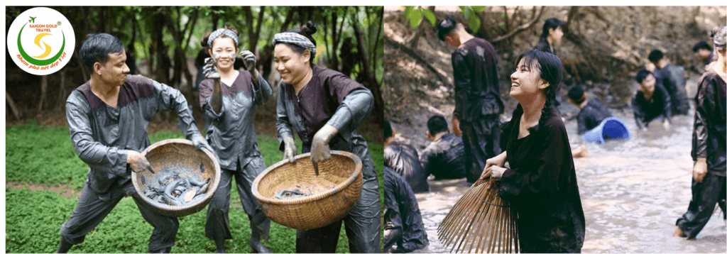 Đến với khu du lịch, Các bạn học sinh sẽ hóa thân thành người nông dân đích thực trong chiếc áo bà ba – trang phục đặc trưng của người miền Tây Nam Bộ mà từ lâu đã gắn liền với con người nơi đây. Sau đó, đoàn chụp hình lưu niệm, hướng dẫn sẽ đưa các bạn đến điểm Tát mương bắt cá tại vườn nhà dân. Các bạn sẽ tự tay bắt những chú cá lóc, cá trê,… và thưởng thức thành quả của mình. Sau đó, Các bạn về Khu du lịch tham gia các trò chơi như: đi dây qua cầu, đi cầu khỉ, cầu xe đạp, tắm hồ bơi.