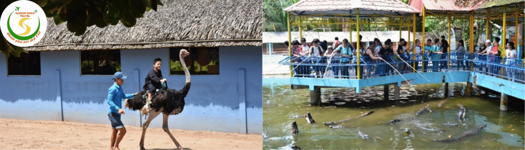 Khu nuôi đà điểu châu Phi trên 150kg: Hóa thân thành Hugo cưỡi đà điểu – một trong những trò chơi cảm giác mạnh đặc biệt hấp dẫn nhất và lần đầu tiên có mặt tại Đồng bằng sông Cửu Long. Quý khách được tìm hiểu về đặc tính sinh học cũng như tên gọi, giá trị kinh tế của giống đà điểu châu Phi này.